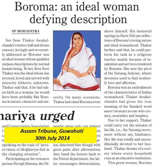 Sree Sree Thakur Anukulchandra’s better half and divine consort lovingly and reverently addressed as ‘Boroma’ was an ideal woman whose qualities surpass descriptions by normal human being. To her, Sree Sree Thakur was the ideal whom she revered, loved and served with sincerity hitherto unknown. Sree Sree Thakur said that, if he had taken birth as a woman, he would have been probably like Boroma in nature, character and sincerity. On many occasions, Sree Sree Thakur had rated Sree Sree Boroma even above himself. His immortal sayings in ‘Narir Niti’ are reflections of Boroma’s loving nature and ideal womanhood. Sree Sree Thakur further said that, he could perform his task as a religious teacher mainly because of inspiration and services rendered by Sree Sree Boroma. She was the pivot of the Satsang Ashram, where devotees used to find motherly love and affection.